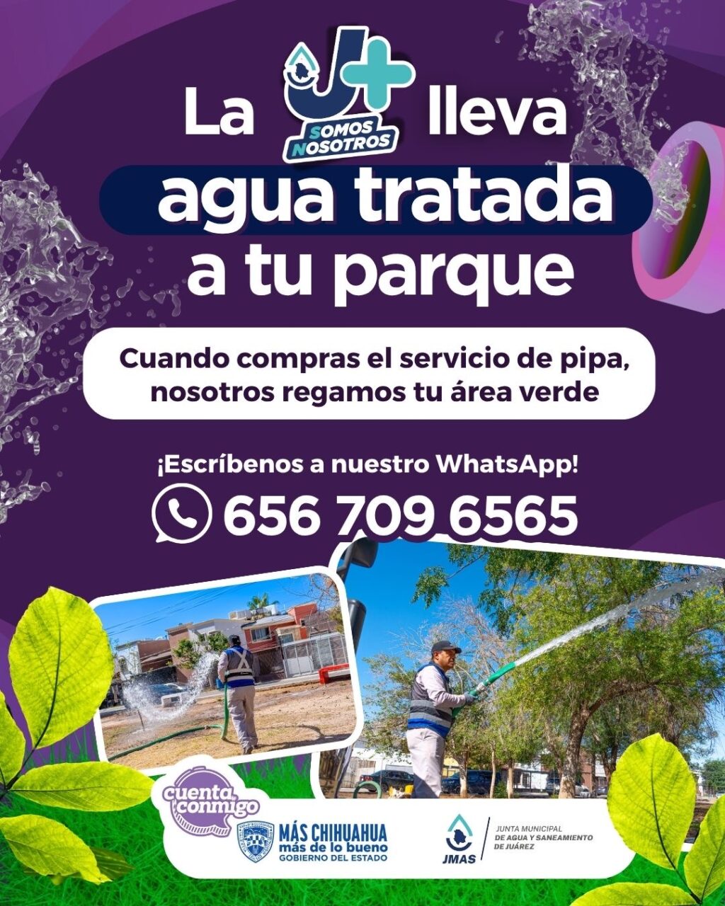 Con la finalidad de preservar el agua potable para el consumo humano, la Junta de Agua y Saneamiento de Juárez promueve que el riego de parques y áreas verdes se haga con agua tratada, para lo cual se realiza su venta en pipas a través del área de Comercialización de Agua Tratada.