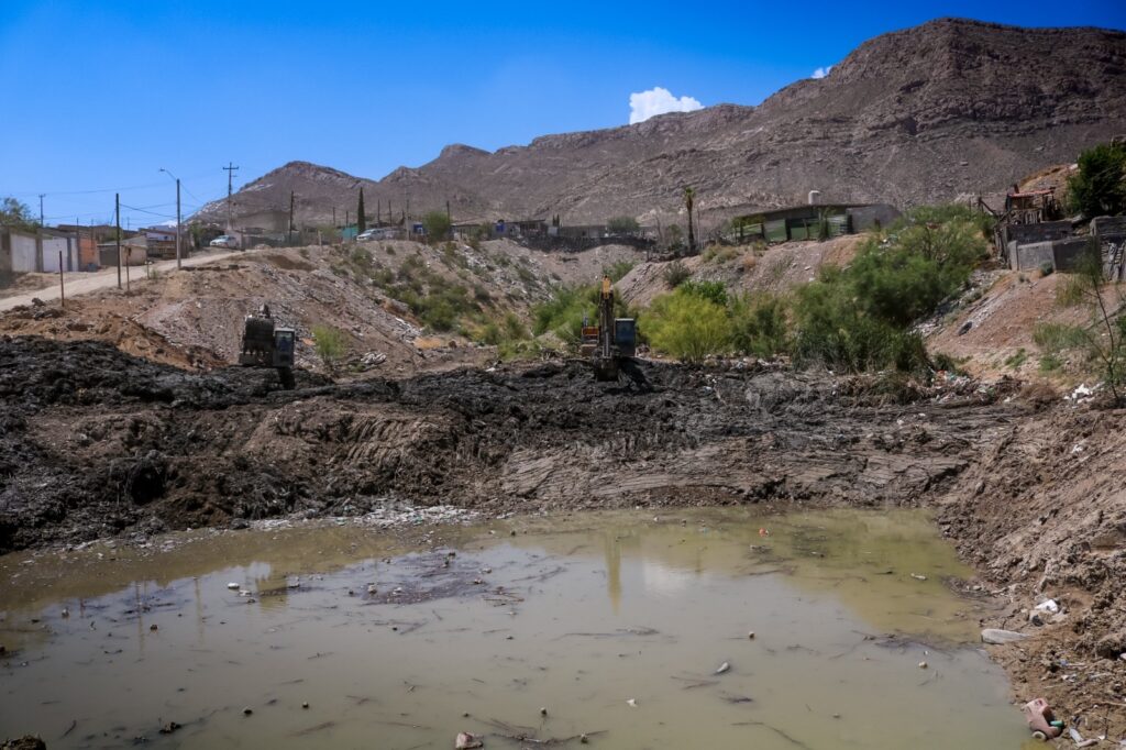 Con el uso de maquinaria pesada y un avance cercano al 70 por ciento, la Junta de Agua y Saneamiento de Juárez continúa la limpieza del dique ubicado en la colonia Plutarco Elías Calles, al norponiente de la ciudad.