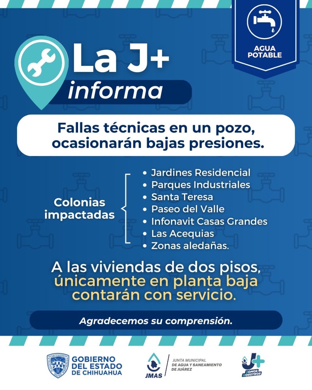 Las colonias que podrían registrar bajas presiones son: Jardines Residencial, Parques Industriales, Santa Teresa, Paseo del Valle, Infonavit Casas Grandes, Las Acequias y zonas aledañas. En viviendas de dos pisos, únicamente tendrán servicio en la planta baja.
