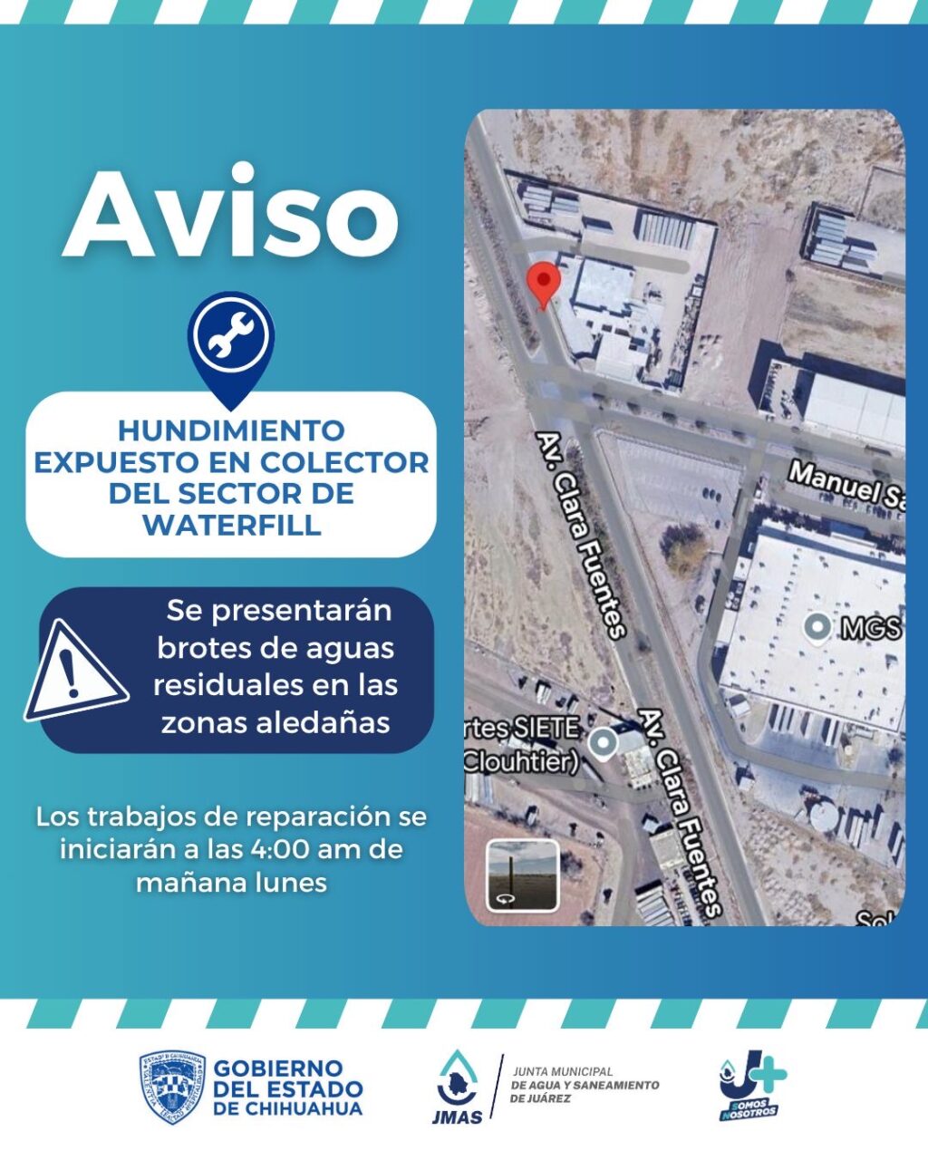 El Departamento de Alcantarillado de la Junta de Agua y Saneamiento de Juárez iniciará los trabajos de reparación a las 4:00 am de mañana lunes. Se estima que concluyan mañana mismo, en horas de la tarde.