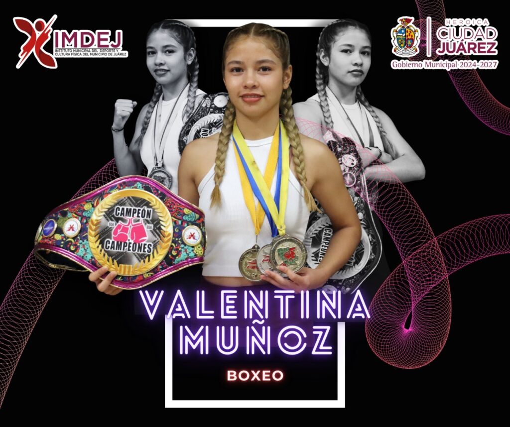 Valentina tiene una trayectoria en el difícil deporte de los puños, el cual inició a los 9 años de edad, en esta ocasión visitó el Instituto Municipal del Deporte y Cultura Física de Juárez para mostrar sus medallas y cinturones de campeona.