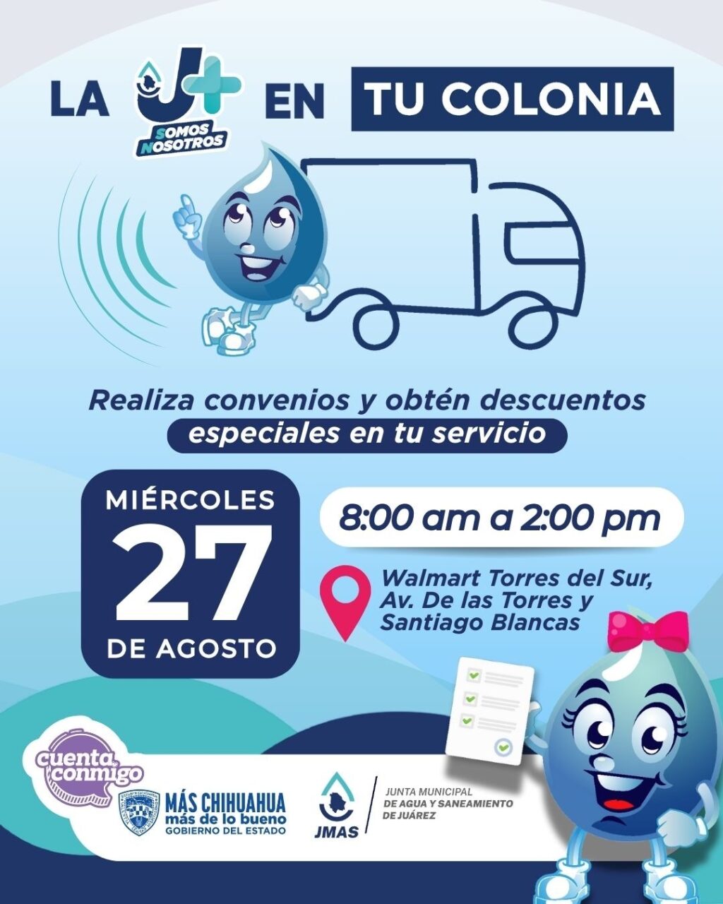 La unidad de la Junta de Agua y Saneamiento de Juárez estará desde las 8:00 de la mañana hasta las 2:00 de la tarde en el Walmart Torres Sur, donde el personal de Atención Múltiple ofrecerá descuentos y convenios para que los usuarios con algún adeudo puedan regularizar sus cuentas para ponerse al corriente.
