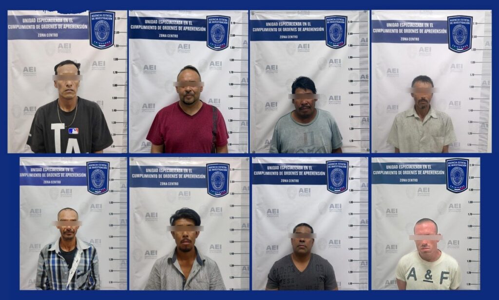 Agentes ministeriales del Grupo Especializado en Cumplimiento a Órdenes de Aprehensión, atendieron los mandatos judiciales en diferentes colonias, con la detención de: Víctor Anselmo C. I., Carlos Iván H. M., Arnulfo Z. U., Álvaro C. L., Noé Benigno L. M., Eduardo Z. P., Miguel Ángel S. G., y Ángel Carlos L. G.