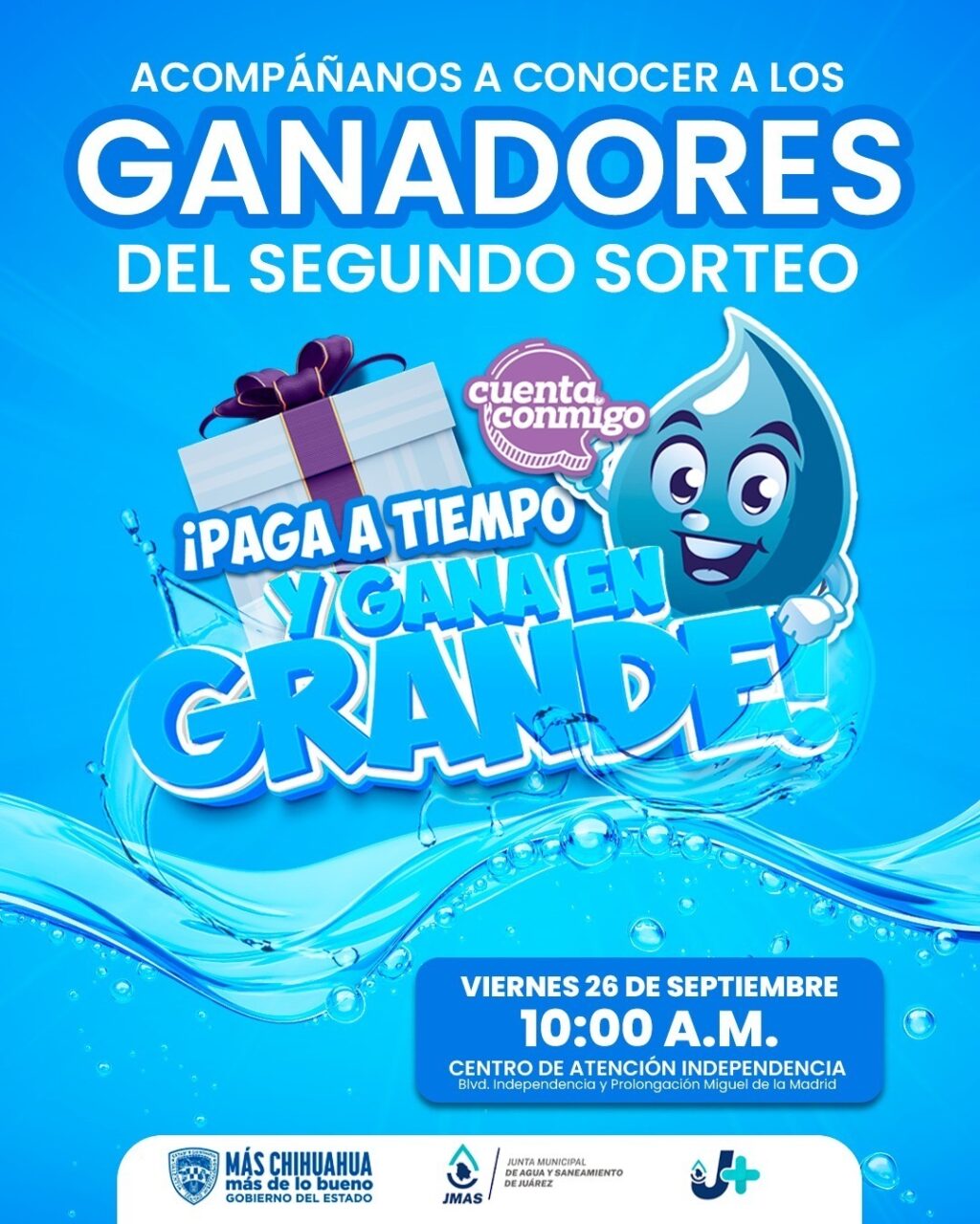 Este viernes 26 de septiembre, la Junta de Agua y Saneamiento de Juárez llevará a cabo el segundo sorteo “Paga a Tiempo y Gana en Grande”, con permiso de la Secretaría de Gobernación 20250131PS09.