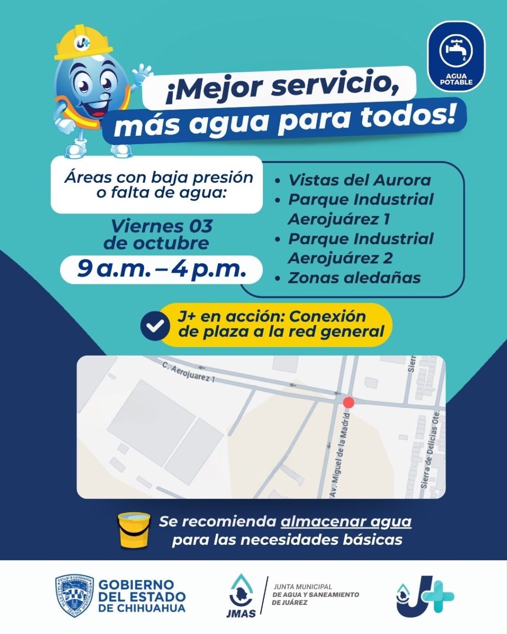 En consecuencia, se impactará la prestación del servicio en los fraccionamientos: Vistas Del Aurora, Parque Industrial Aero Juárez 1, Parque Industrial Aero Juárez 2 y zonas aledañas.