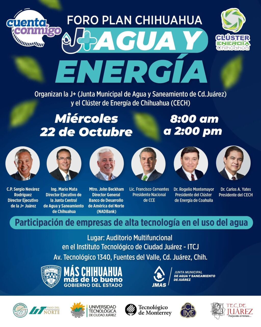 Este miércoles 22 de octubre, se llevará a cabo el Foro Plan Chihuahua Agua y Energía, organizado por la Junta de Agua y Saneamiento de Juárez en coordinación con el Clúster de Energía de Chihuahua.
