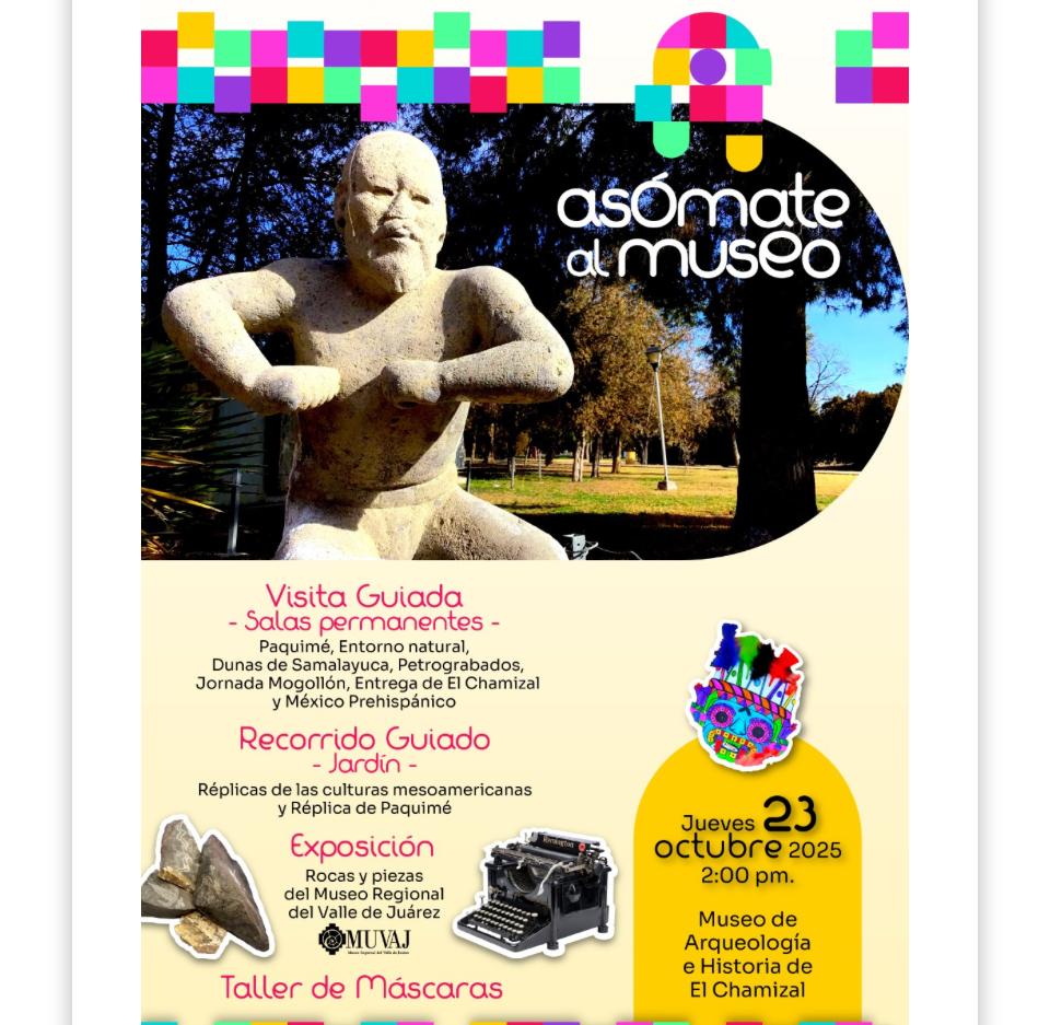 La actividad iniciará a las 2:00 de la tarde con un recorrido guiado por las salas permanentes del recinto, donde los estudiantes conocerán exposiciones como Paquimé, Entorno Natural, Dunas de Samalayuca, Petrograbados y Jornada Mogollón.