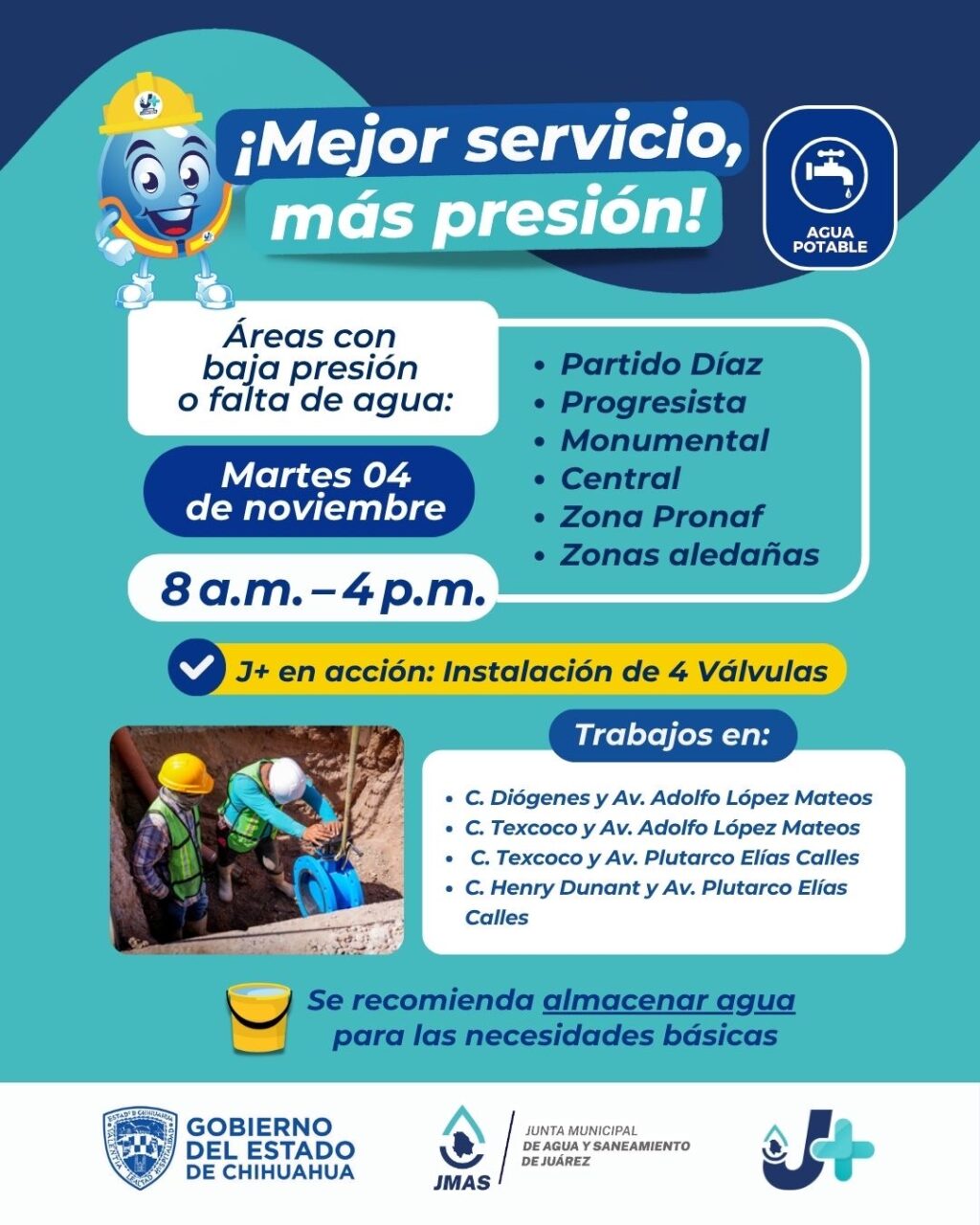 La Junta de Agua y Saneamiento de Juárez (J+) sigue avanzando con el plan de Sectorización de la red de agua potable, por lo que este martes 4 de noviembre se instalarán cuatro válvulas nuevas que ayudarán a mejorar el servicio con mayor presión, así como mejor distribución y control del recurso.