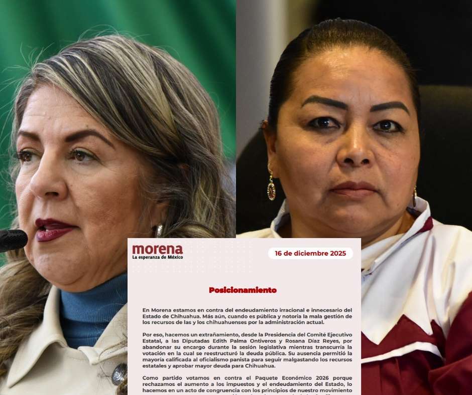Por eso, hacemos un extrañamiento, desde la Presidencia del Comité Ejecutivo Estatal, a las Diputadas Edith Palma Ontiveros y Rosana Díaz Reyes, por abandonar su encargo durante la sesión legislativa mientras transcurría la votación en la cual se reestructuró la deuda pública. Su ausencia permitió la mayoría calificada al oficialismo panista para seguir malgastando los recursos estatales y aprobar mayor deuda para Chihuahua.