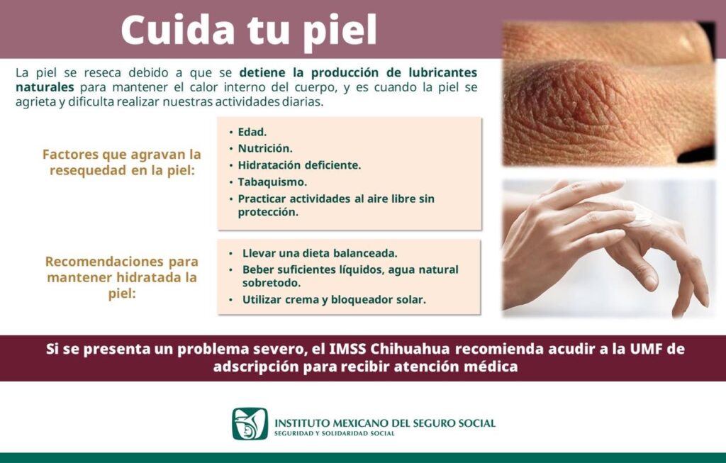 El Instituto Mexicano del Seguro Social (IMSS) en Chihuahua, recomienda mantener precaución ante el frío, ya que éste puede causar resequedad en la piel, lo que ocasiona pequeñas lesiones superficiales que suelen ser dolorosas y molestas.