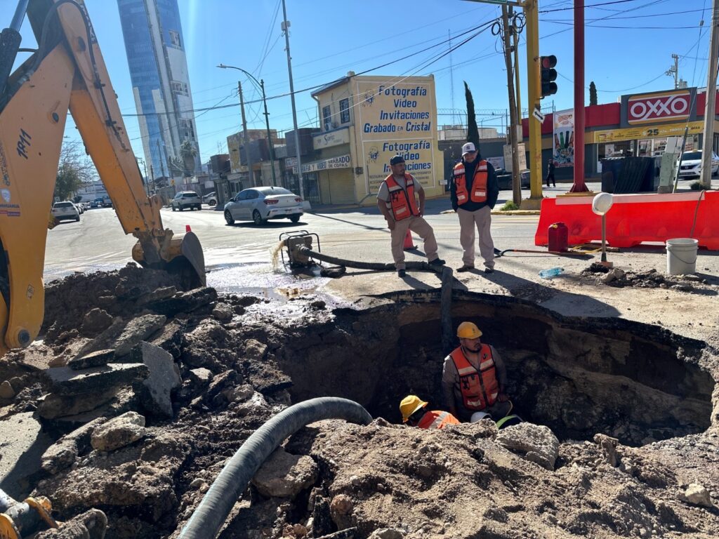 La Junta de Agua y Saneamiento de Juárez, trabaja en la reparación de una fuga registrada en la red general de agua potable en la Zona Centro.