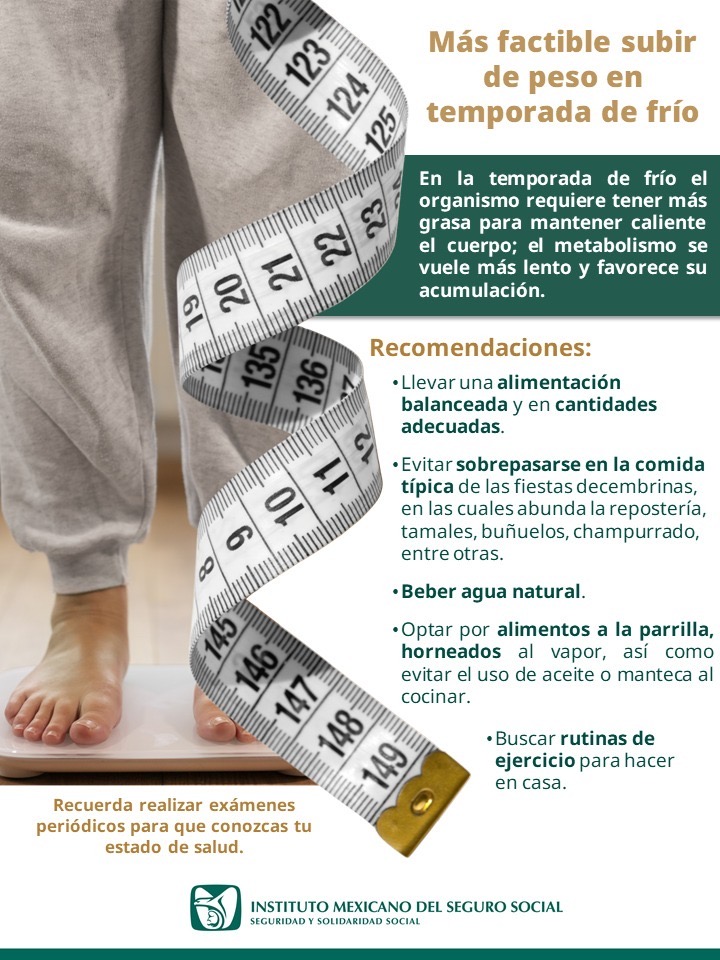 El Instituto Mexicano del Seguro Social (IMSS) en Chihuahua recomienda a la población seguir una dieta balanceada y realizar ejercicio, ya que durante la temporada invernal es más factible subir de peso.