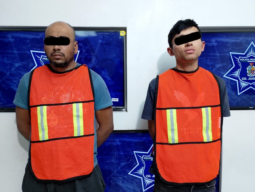 A 14 de enero de 2026.- Agentes de la Secretaría de Seguridad Pública Municipal arrestaron a Julio Adrian D. M. y Julio Gustavo A. R., por su presunta responsabilidad en la comisión del delito de posesión de vehículo con reporte de robo y delitos contra la salud.