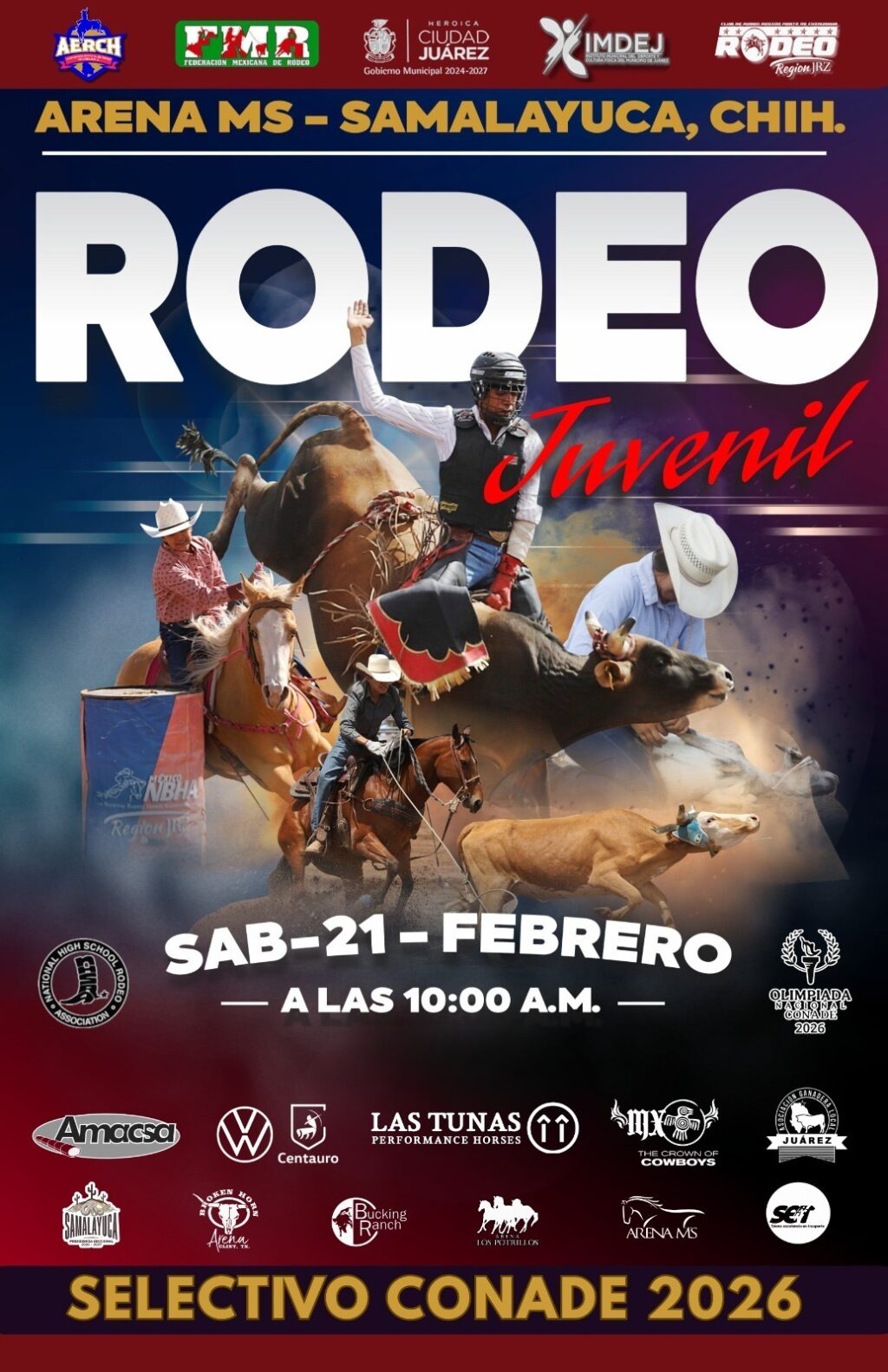 El sábado 21 estará lleno de acción con las etapas estatales CONADE 2026, en la segunda fecha del Selectivo Estatal de Rodeo la cual se realizará en la Arena MS en el poblado de Samalayuca a las 10:00 de la mañana.
