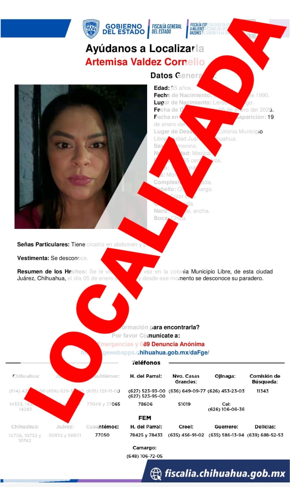 Elementos de la Fiscalía Especializada en Atención a Mujeres Víctimas del Delito por Razones de Género y a la Familia de la Zona Norte, localizó sana y salva a Artemisa V. C., quien contaba con reporte de desaparición y/o ausencia desde el día 19 de enero del presente año, en Ciudad Juárez.
