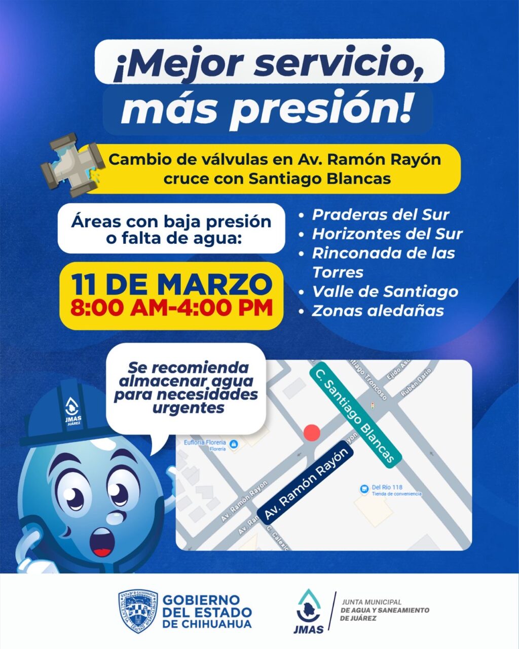 Este miércoles 11 de marzo, la Junta de Agua y Saneamiento de Juárez, realizará trabajos de sustitución de válvulas al sur oriente de la ciudad, para mejorar el suministro de agua potable y la operación de la red hidráulica.