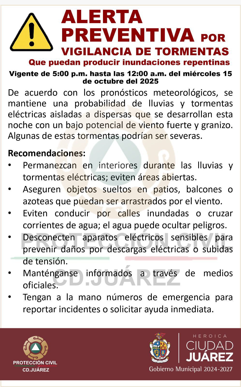 La Dirección General de Protección Civil del Gobierno Municipal emitió una alerta preventiva por tormentas, vigente desde las 5:00 de...