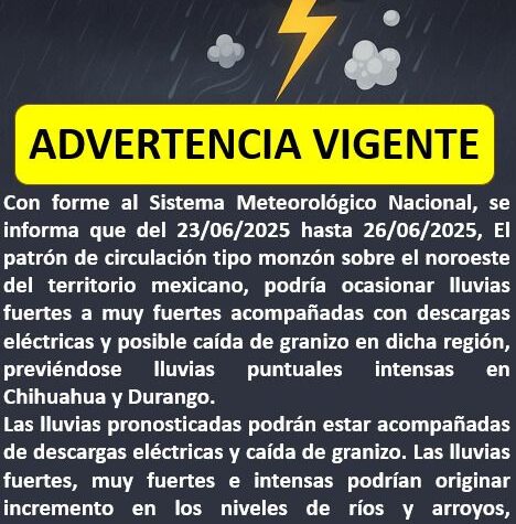 -Para este martes se esperan precipitaciones de fuertes a muy fuertes en Ahumada, Guachochi, Guadalupe y Calvo, Batopilas y Urique...