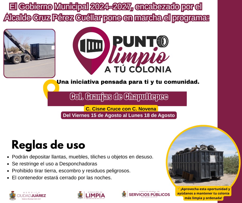 “Con Punto Limpio a tu Colonia buscamos que la gente tenga un lugar cercano y seguro para depositar estos materiales, evitando focos de infección y mejorando la imagen urbana. Este es un trabajo en equipo entre Gobierno y vecinos para mantener nuestras colonias limpias y ordenadas”, expresó.