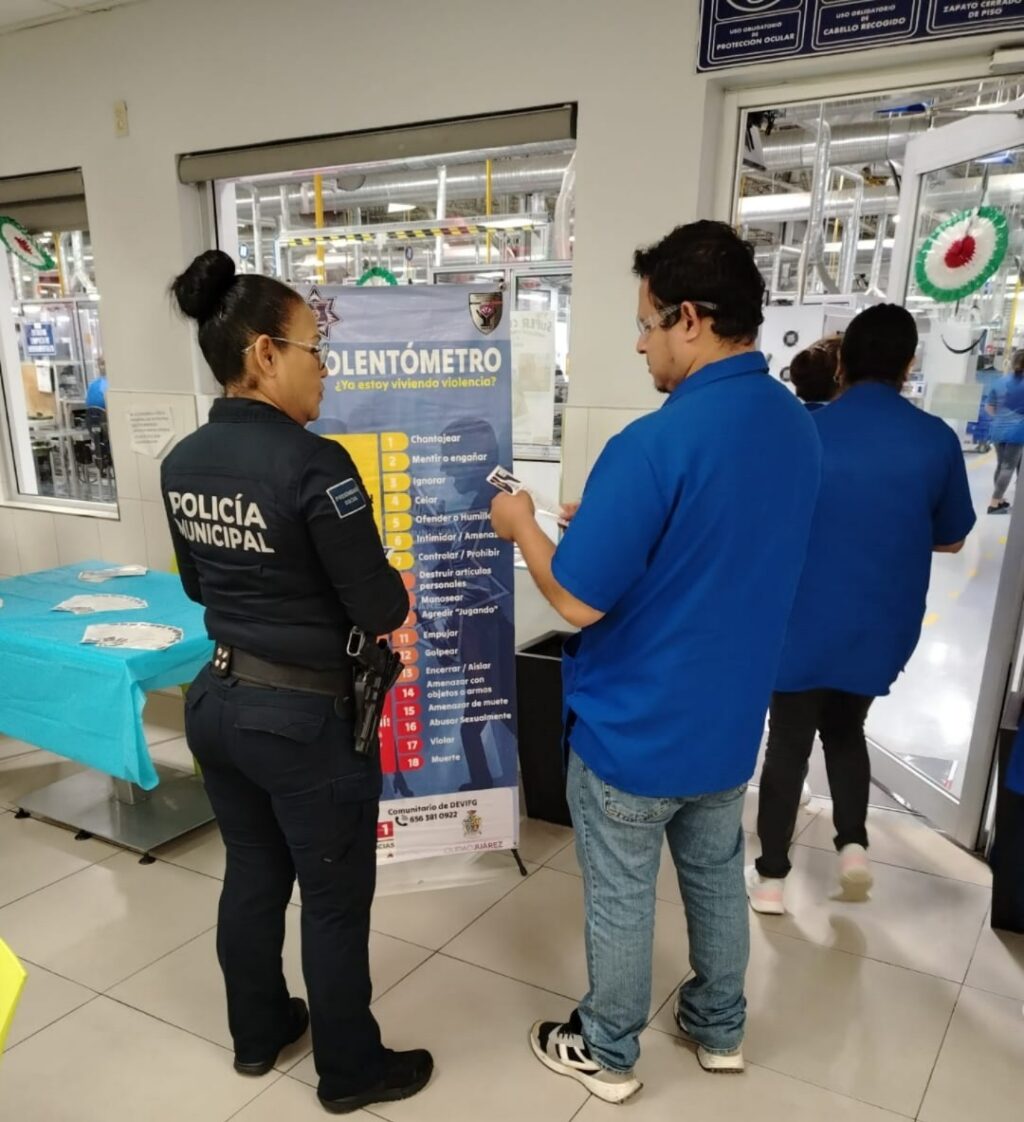 A 18 de septiembre de 2025-. Elementos de la Secretaría de Seguridad Pública Municipal adscritos a la Dirección Especializada en Violencia Familiar y de Género (DEVIFG), acudieron a las instalaciones de la empresa maquiladora Harman Becker, con la finalidad de instalar un módulo informativo además de entregar trípticos en materia de violencia familiar.