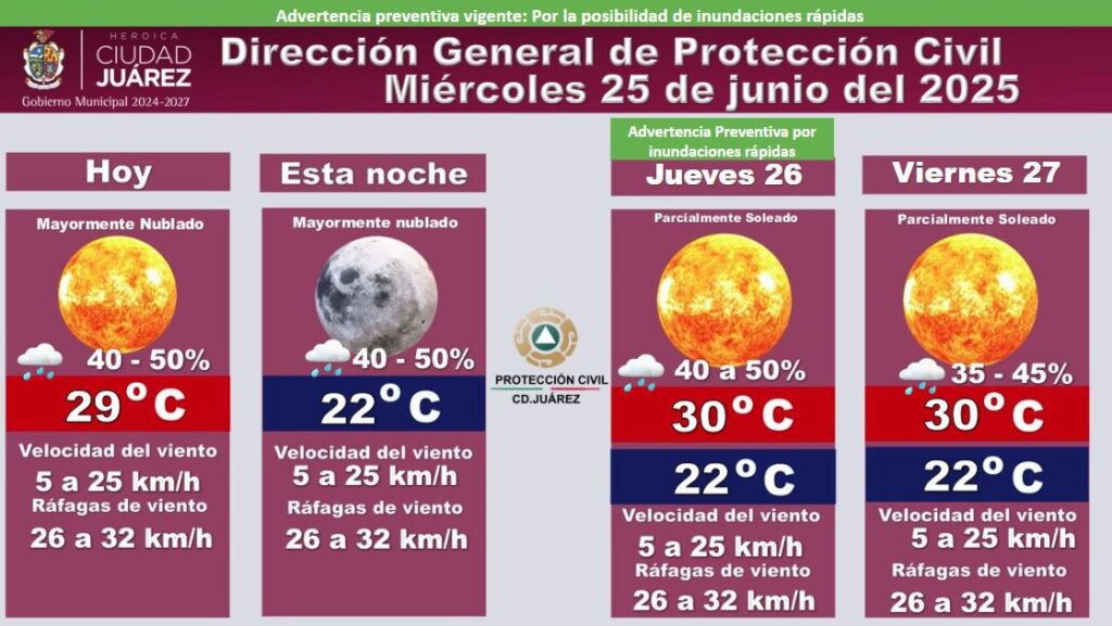 La Dirección General de Protección Civil del Municipio emitió el pronóstico del clima para hoy 25, mañana jueves 26 y viernes 27 de junio, advirtiendo sobre la posibilidad de lluvias con potencial de inundaciones rápidas.