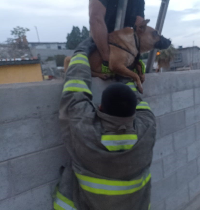 Luego de un reporte ciudadano, los elementos acudieron al lugar y utilizando una escalera de 14 pies y una cuerda, lograron localizar al canino, capturarlo y extraerlo de manera segura, evitando que resultara herido o que su situación empeorara.